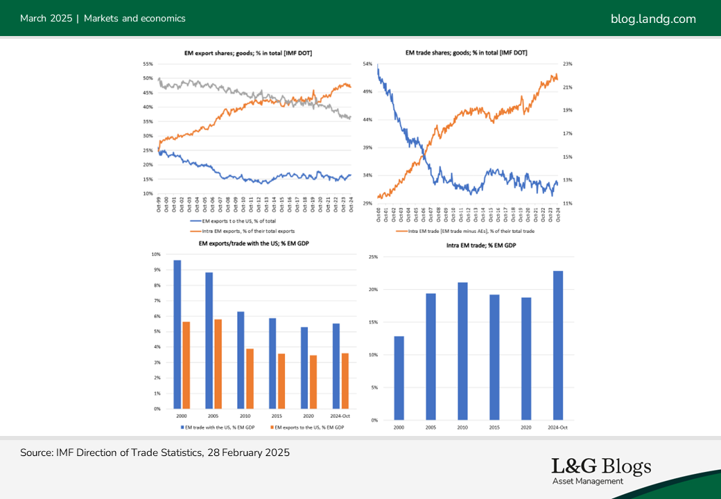 The importance of the US – and advanced economies in general – as the destinations for EM exports has declined, while trade between emerging markets has grown. As the charts below show, in the late 1990s/early 2000s, as much as 75% of EM exports went to advanced economies including the US, which alone accounted for a quarter of this figure.